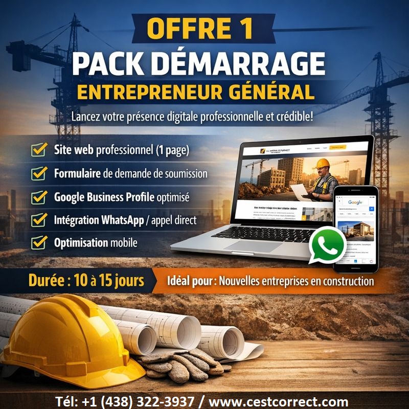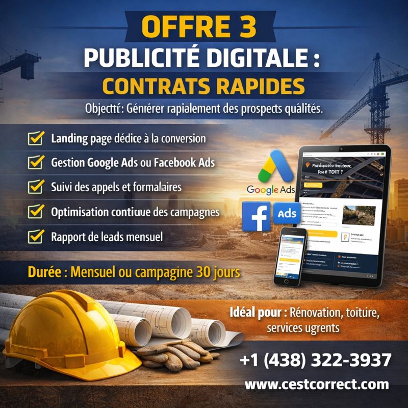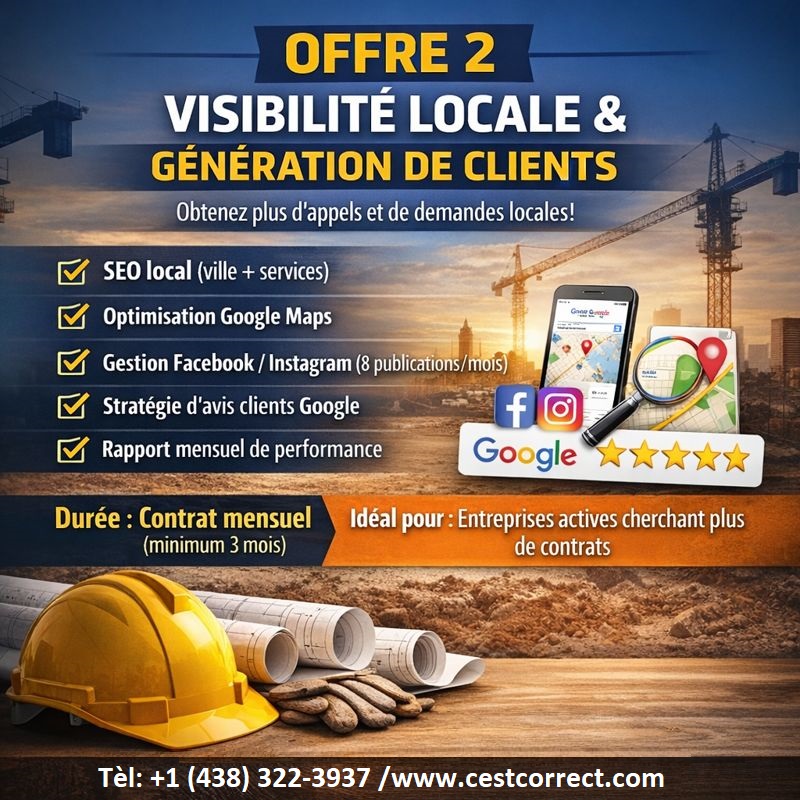 - Sélectionner - OFFRE 1: Lancer une présence digitale professionnelle et crédible. OFFRE 2: Obtenir plus d’appels et de demandes locales. OFFRE 3: Générer rapidement des prospects qualifiés. OFFRE 4: TOUT-DANS-UN / Développement d’affaires & stratégies de croissance Accompagnement E-commerce / Marketplace Autre besoin