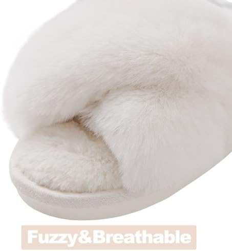 Pantoufles pelucheuses en mousse à mémoire de forme avec bande croisée pour femme, BLANC Amazon.ca Mode